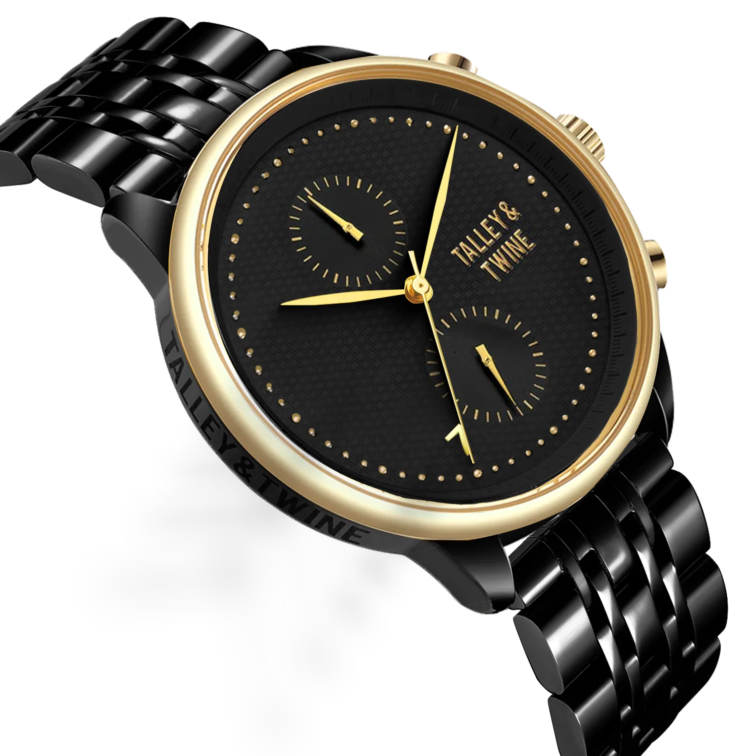 Encased in a bold 46mm two-tone stainless steel case—featuring an opulent black and gold finish—the Pharaoh is a beacon of strength and sophistication. Its sapphire crystal offers unparalleled scratch resistance, while the precise Miyota movement ensures you stay on time and in control. A sleek all-black stainless steel bracelet anchors the piece with modern luxury and enduring strength.