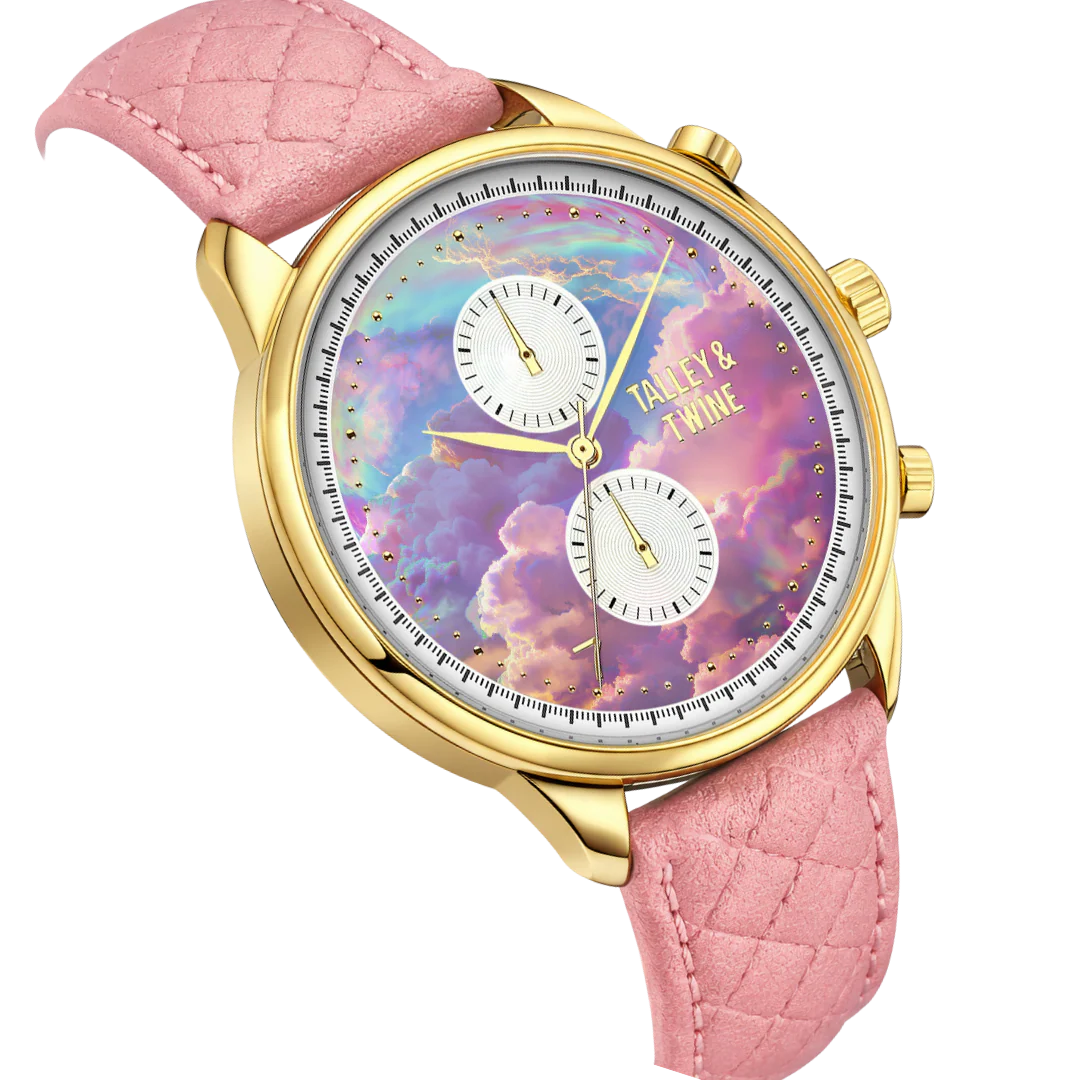 Meet the Pink Unicorn, a timepiece created for the woman who was never meant to blend in. Rare, radiant, and beautifully inexplicable, this 41mm statement watch is a celebration of individuality in its most colorful form. With its dreamy, cloud-washed dial, blush pink strap, and polished gold-tone case, the Pink Unicorn brings together playful elegance and bold personality in a way only Talley & Twine can.